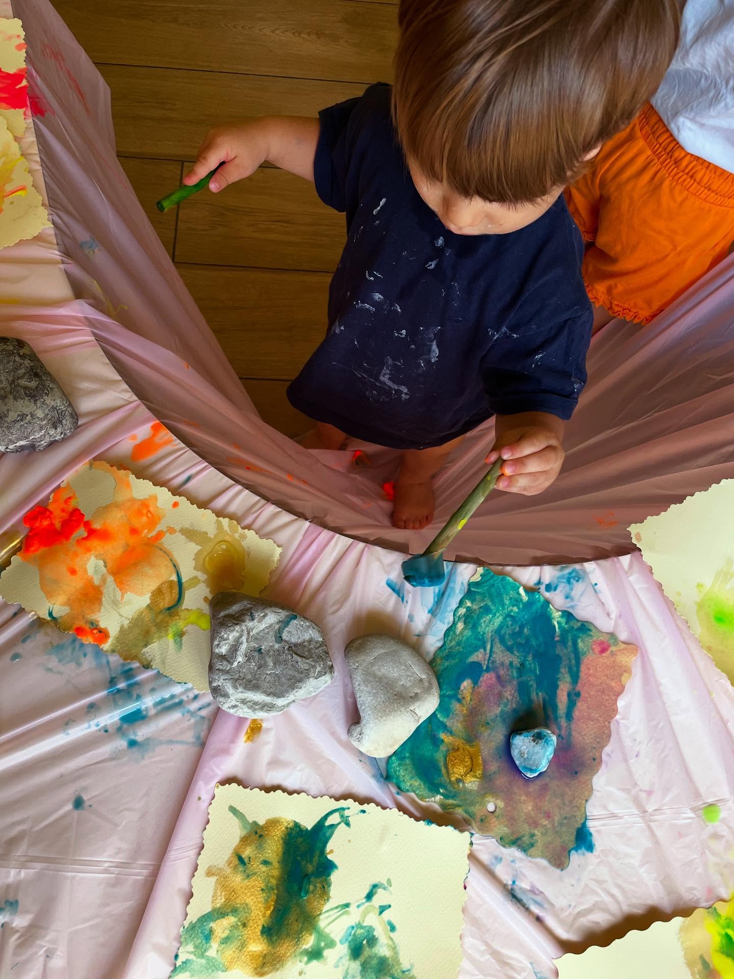 Esplorazione libera dei colori con pigmenti naturali, tempere ecologiche e tecniche pittoriche diverse.